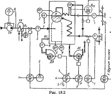 Развернутая схема автоматизации парогенератора с большим количеством коммуникаций и линий связи достаточно сложна, поэтому на рис. 18.2 приведена упрощенная схема автоматизации газомазугного котла с нанесением блоков регулирования основными процессами.