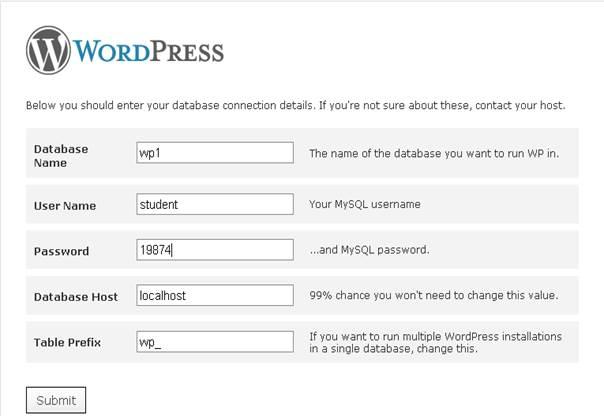 Последний шаг установки. Здесь вам нужно ввести: имя базы данных, имя пользователя базы данных и пароль пользователя базы данных