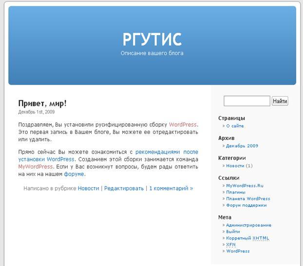 Представленный ниже скриншот показывает стандартное завершение установки, так будет выглядеть Ваш блог. В интернете существует множество различных тем, шаблонов и дополнений к данной программе, мы же рассмотрим стандартное ее приложение, принцип работы все равно не измениться.