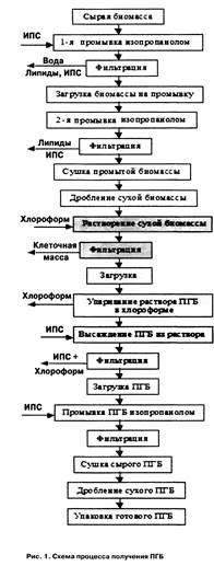 Контроль исходных, промежуточных и конечных продуктов в процессе выделения и очистки ПГБ из сырой биомассы проводили в соответствии со схемой, представленной на рис. 3.