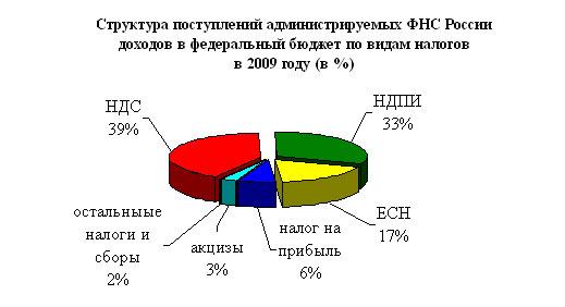 Показатели, заложенные на 2009 год в Федеральном законе «О федеральном бюджете на 2009 год и на плановый период 2010 и 2011 годов» в части ФНС России, выполнены. Бюджет получил дополнительно 402 млрд. рублей. Основная масса администрируемых ФНС России доходов федерального бюджета обеспечена поступлениями НДС (39%), налога на добычу полезных ископаемых (33%), ЕСН (17%) и налога на прибыль (6%).