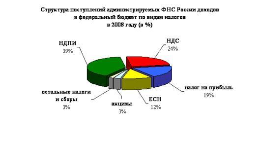Основная масса администрируемых ФНС России доходов федерального бюджета обеспечена поступлениями налога на добычу полезных ископаемых (39%), НДС (24%) и налога на прибыль (19%).