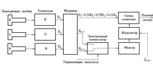 В результате еще одного матрицирования, осуществляемого в цепях модулятор—катод кинескопа, получают управляющие сигналы E