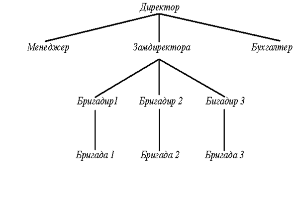 Во главе НПП ”Апекс” стоит директор. В его непосредственном подчинении находятся: заместитель, менеджер, бухгалтер. Менеджер ищет, принимает и оформляет заказы. Заместитель директора занимается организацией строительных работ. В подчинении у заместителя директора находятся бригадиры. Бригадиры руководят бригадой, насчитывающей от 2-3 до 8-10 рабочих в зависимости от объёма выполняемой работы.