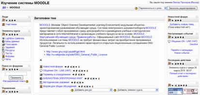 Рисунок 2.127 – Окно нового учебного курса "Изучение системы MOODLE" в режиме редактирования курса