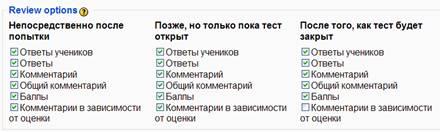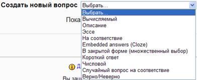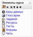Тест. Этот элемент позволяет преподавателю создать набор тестовых вопросов. Все вопросы хранятся в базе данных и могут быть впоследствии использованы снова в этом же курсе (или в других). По результатам тестирования выставляется оценка (либо в автоматическом режиме, либо вручную). Тест может содержать различные типы вопросов (множественный выбор, верно/неверно, числовой и др).