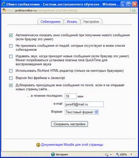 Как и при создании других ресурсов и элементов курса, оконная форма создания чата условно поделена на секции с полями, которые необходимо заполнить. В секции Основные требуется заполнить поля Название чата (отображается как ссылка в основном окне курса) и Вступительный текст (отображается участникам при входе в чат). Далее необходимо выставить дату и время, с которой чат будет доступен пользователям учебного курса, в полях Следующее время чата. Если в поле Повторять сесси выставить значение В это же время каждый день или В это же время каждую неделю, то чат будет доступен в определенное время ежедневно или еженедельно соответственно. В поле Количество запоминаемых сообщений необходимо задать время в днях (от 2 до 365), на протяжении которого сообщения будут храниться на сервере. Если предполагается хранить сообщения чата постоянно, то установите в этом поле значение Никогда не удалять сообщения. Будьте осторожны с этим параметром настройки и не устанавливайте без особой необходимости слишком большой срок хранения сообщений, т.к. это приведет к затратам дискового пространства на сервере. При завершении всех настроек нажмите кнопку Save and display , для сохранения изменений и просмотра результата. Или нажмите кнопку Отмена.