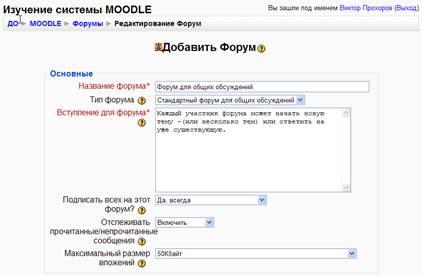 Поле Вступление будет отображаться всем участникам при открытии страницы форума. В этом поле можно воспользоваться визуальным редактором для форматирования текста, вставки рисунков и таблиц, а так же HTML тегов. Поля Подписать всех на этот форум и Отслеживать прочитанные/непрочитанные сообщения отключают или включают режим при котором все участники курса будут получать на e-mail информацию о сообщениях на форуме. Поле Максимальный размер вложений задает размер файла, который может быть прикреплен к сообщению. Этот параметр (максимальное значение) зависит от глобальных административных настроек сервера и курса.