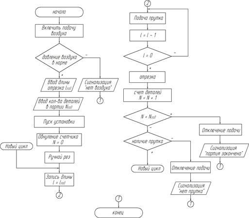 После начала работы необходимо включить подачу воздуха, после этого производится проверка давления воздуха в системе. Если оно падает ниже определенного предела, установка отключается и производится сигнализация "нет воздуха". Если давление в норме, производится ввод длины отрезка и количества деталей в партии. Далее обнуляется счетчик деталей. Производится ручной рез, после чего начинается цикл работы. Производится запись длины отрезка в память блока управления. Далее производится подача прутка. При перемещении прутка на 1 мм выдается счетный импульс, который уменьшает длину отрезка в памяти на 1 мм. После этого производится проверка равенства нулю длины отрезка. При невыполнении условия осуществляется возврат к подаче прутка. При выполнении условия производится отрезка кольца, и количество деталей увеличивается на одну. Далее проверяется условие равенства числа деталей числу, записанному в память счетчика деталей. При равенстве отключается подача прутка и выдается сигнализация "конец партии". Если же равенство не выполняется, проверяется наличие заготовки. Если пруток закончился, подача также отключается и включается сигнализация "нет прутка". Если заготовка есть, то начинается новый цикл работы.