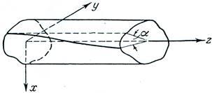 Предположим, что один конец стержня призматического сечения, длины L, закреплен в плоскости ху, а на другой конец действует пара, вектор-момент который направлен вдоль оси z (рис. 1). Мы полагаем, что закрепленный конец не может вращаться, но что оба конца могут свободно перемещаться друг относительно друга в направлении z. Под действием пары стержень будет закручиваться, причем образующие цилиндра будут превращаться в винтовые линии. Угол поворота любого поперечного сечения зависит от расстояния, на котором находится это сечение от закрепленного конца. При малой деформации можно считать, что угол закручивания пропорционален расстоянию между сечением и закрепленным концом. Таким образом,