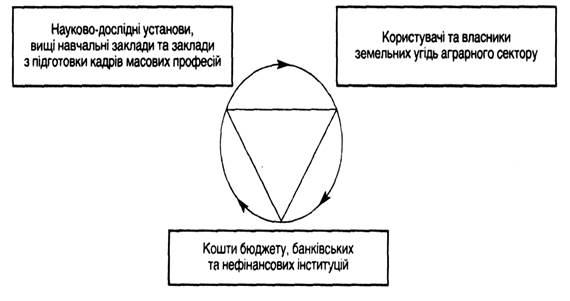 Роль науково-дослідних установ, вищих навчальних закладів, а також закладів з підготовки масових кадрів (коледжів, технікумів, професійних училищ тощо) полягає в безпосередній розробці наукових ідей, винаходів, новітніх технологій, прямо пов'язаних з генезисом, апробацією та дифузією інноваційних продуктів. Зрозуміло, що для цього їм потрібні фінансові ресурси, обсяг яких покривав би не лише потребу в заробітній платі, а й затрати на ту частину інноваційної діяльності, яка припадає, власне, на дану ланку. При цьому, на нашу думку, важливим є регулювання інноваційних розробок, які б наукові інституції та їх складові направляли безпосередньо на потреби відтворення земельних ресурсів аграрного сектору. Насамперед ідеться про адресність, комплексність та цільове спрямування наукових досліджень, які прямо стосуються землі. Земельні ресурси нині вимагають найпильнішої уваги не лише із суто споживацьких матеріальних потреб, а й з огляду на пристосованість інноваційних продуктів до розв'язання проблем збереження, поліпшення й охорони земельних ресурсів тощо. При цьому одночасно необхідно налагодити оптимальне розв'язання екологічних і соціальних складових відтворювального процесу.