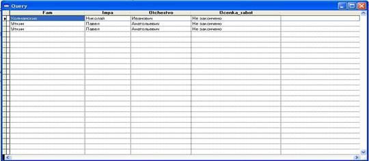 SELECT fam, imya, otchestvo, Ocenka_rabot FROM rabotchie, naryad WHERE ((rabotchie.key_tabel=naryad.tab_nomer) AND (Ocenka_rabot='Не закончено'))