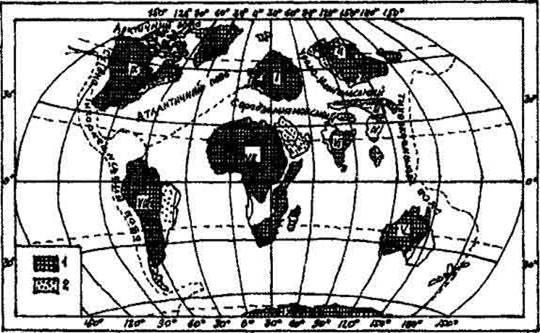 Платформи: І - Східно-Європейська; П - Сибірська; Ш - Північно-Китайська; ІV - Південно-Китайська; V - Австралійська; VІ - Індостанська; VІІ - Африканська; VШ - Південно-Американська; IX - Північно-Американська; X - Східно-Антарктична