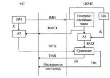 На рис. 3.2 наведена спрощена схема аутентифікації МС в стільниковій системі стандарту GSM. При надходженні від МС запиту ЦКМС передає у відповідь випадкове число RAND. За алгоритмом А3 з допомогою секретного числа К1