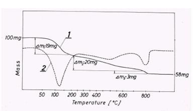 Контроль воды и содержания CO2 в отложениях после MWT проводился двумя независимыми способами. В качестве другого метода использовался термогравиметрический анализ (DTA) отложений из Блока 10 выполненный с использованием прибора Мётлера [Motler]. Кривая 1 на рисунке 8 иллюстрирует зависимость массы как функции температуры. Потеря воды (влажности) происходит при 1400C и сопровождается изменением массы Dm1»19 %, потеря кристаллизационной воды происходит при 7500C и приводит к Dm1»20 % и потере CO2, дальнейший нагрев в диапазоне 7500C – 8000C дает Dm1»3 %. Кривая 2 иллюстрирует производную изменения массы. Таким образом, при различных методах исследования, в отложениях обнаруживается недостаток карбонатов. Вероятным объяснением малого количества CO2, обнаруживаемого методом DTA, может быть кристаллизация карбонатов до входа в блок.