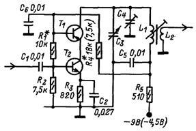 В супергетеродинных приемниках высокого класса и в приемниках прямого усиления с числом перестраиваемых контуров более одного целесообразно применять каскодные усилители (рис.6). [7, c.44] Устойчивый коэффициент усиления такого усилителя с транзисторами, имеющими высокую граничную частоту, при рациональном выполнении монтажа очень велик, что достигается благодаря малой проходной емкости каскада ОБ. Такие усилители хорошо работают в диапазоне УКВ. Так как коэффициент усиления первого транзистора по напряжению равен 1, то напряжение питания между его эмиттером и коллектором можно выбрать небольшим (1 - 2 В), обеспечив тем самым запас по питанию второго транзистора, и избежать ограничения в его коллекторной цепи при значительных амплитудах сигнала па выходе. Температурная стабилизация осуществляется включением в цепь эмиттера резистора R3