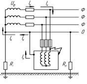 Зануленням (рис. 12) називається навмисне електроз'єднання з нульовим захисним провідником металевих неструмопровідних частин, які можуть виявитися під напругою. Занулення застосовується в мережах напругою до 1000В з глухим заземленням нейтралі. В цьому випадку корпуси електроустаткування електрично з'єднуються з нульовим захисним дротом, що має значно менший опір, ніж заземлення. При однофазному замиканні на корпус буде коротке замикання, яке приведе до швидкого спрацьовування захисту і відключення пошкодженого устаткування. Струм короткого замикання має бути в 3 рази більшим за номінальний струм, тобто .