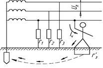 набагато менший опору витоків r, ємкісного опору фаз відносно землі і самої людини , - опір розтікання струму в землі при стіканні струму з людини в землю.