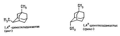 В дизамещенных производных адамантана с одним мостиковым заместителем пространственная ориентация мостикового заместителя может быть аксиальной (а) или экваториальной (е) в зависимости от расположения заместителя по отношению к плоскости общего для обоих заместителей циклогексанового кольца или ее можно обозначить как цис- и транс- :