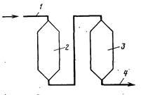 1,4 — подача исходной и отвод умягченной воды; 2 — натрий- катионитовый фильтр; 3 — хлор-аиионитовый или совместный натрий—хлор-ионитовый фильтр