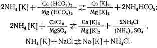 Как видно из реакций обмена, в фильтрате образуются соли аммония, соответствующие имеющимся в воде анионам. Аммоний-катионированная вода умягчается, а щелочность ее имеет такую же величину, как и у исходной воды.