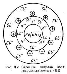 Коллоидная частичка вместе с окружающим ее диффузным слоем называется мицеллой. На рис. 3.2 представлена схема строения мицеллы золя Fe(OH)3, полученного вследствие гидролиза FeCl3. Золь — система, состоящая из коллоидных частичек, распределенных в жидкой среде. Если такой средой является вода, система называется гидрозолем. Как видно из рис. 3.2, мицелла Fe(OH)3 состоит из ядра, образованного молекулами Fe(OH)3, адсорбционносвязанных с ним потенциалобразующих водородных ионов (Н+) и некоторого количества ионов хлора С1 меньшего, чем количество ионов Н+, в результате чего коллоидная частичка имеет положительный заряд. Ионы Н+ и входящие в состав частички противоионы С1- образуют двойной электрический слой. Отдельные ионы хлора (С1-) образуют диффузный слой и вместе с коллоидной частичкой составляют мицеллу золя Fe(OH)3