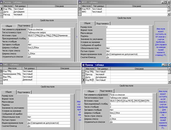 По ключевому полю Код МОЛ таблицы «МОЛ» и полю Код МОЛ таблицы «Приход» установлена связь. Эти поля имеют одинаковый тип данных и одинаковые значения свойств. Тип установленной связи – один ко многим. Между таблицами «ТМЦ», «Приход» и «Расход» по полю Код ТМЦ установлена связь один ко многим, поле Код ТМЦ является ключевым для таблицы «ТМЦ».