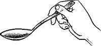 Ложку следует держать в правой руке так, чтобы конец ручки ложки лежал на основании указательного пальца, а начало ручки ложки — на среднем пальце. Большим пальцем при этом нужно слегка прижать ручку сверху к среднему пальцу, а указательным — поддерживать ее сбоку (рис. 3).