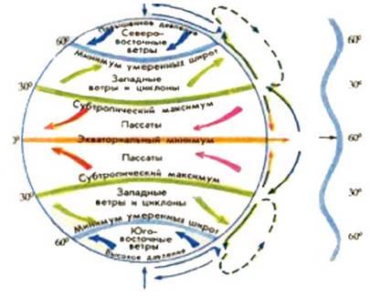 В нижней тропосфере преобладающие направления переноса воздуха различаются по географическим поясам. В полярных широтах восточные ветры; в умеренных — западные с частым нарушением циклонами и антициклонами, наиболее устойчивы пассаты и муссоны в тропических широтах. В связи с разнообразием подстилающей поверхности на форме общей циркуляции атмосферы возника ют районные отклонения — местные ветры.
