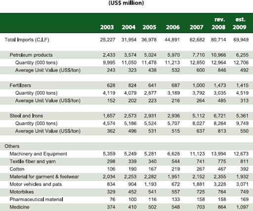 Импорт в 2009 г. составил $80 млрд. Основными статьями импорта являются не сырая нефть, железо, сталь, одежда, техника, золото, грузовые автомобили, полуфабрикаты из стали, соя, запчасти на автомобили, полимеры (табл. 3).