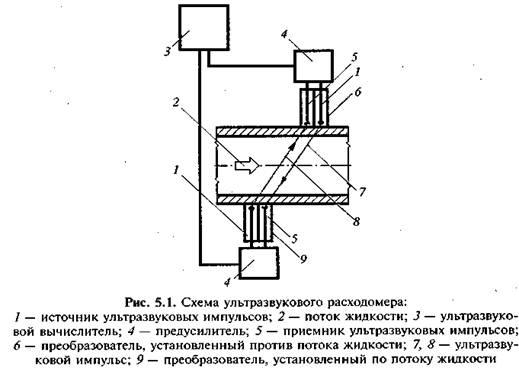 Этого недостатка лишены ультразвуковые расходомеры. В основу работы ультразвуковых расходомеров положен время-импульсный принцип, сущность которого заключается в измерении и определении разности скоростей ультразвуковых зондирующих импульсов, проходящих по направлению потока жидкости и против него (рис. 5.1).