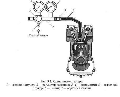 Пневмотестер состоит из входного штуцера 7, в который подается сжатый воздух под давлением 0,6...1,0 МПа; манометра 3 для измерения давления подаваемого воздуха; регулятора 2 давления подаваемого воздуха; обратного клапана 7; манометра 4 для измерения давления в камере сгорания (давление равно давлению подаваемого воздуха минус утечки); выходного штуцера 5; шлангов 6 и адаптеров для подсоединения к свечному отверстию (рис. 5.3).