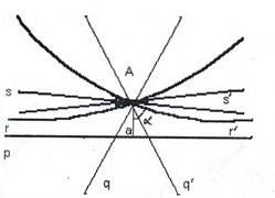 расходящиеся с прямой p ). Угол между прямой, проведенной через точку А параллельно прямой р, и перпендикуляром, опущенным из А на р, Лобачевский называет « углом параллельности» и показывает, что функция, выражающая зависимость этого угла от длины а перпендикуляра, может быть (в современных обозначениях) записана в виде