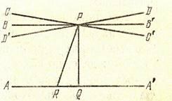 Доказательство. Пусть прямая ВВ параллельна в точке Р прямой АА. Рассмотрим точку Q, лежащую от точки Р в сторону параллельности, т.е. по ту же сторону от прямой PR, соединяющей Р с некоторой точкой R на АА, что луч RA. Возьмем какой-нибудь луч QQ, проходящий внутри угла BQR, обращенного своим отверстием в сторону параллельности, и докажем, что он пересекает луч RA. Для этого соединим какую-нибудь его точку QcP; луч PQпересечет RAв некоторой точке S ( так как прямая ВВ параллельна прямой АА в точке Р). Луч QQ, пересекающий сторону PS треугольника RPS, не может пересечь отрезка PR (так как тогда он проходил бы внутри смежного угла PQR) и не проходит ни через одну из вершин этого треугольника. Поэтому он должен пересечь отрезок PS. Таким образом, теорема доказана для того случая, когда точка Q расположена от точки Р в сторону параллельности.
