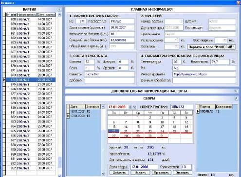 У лівій частині програми розташований список партій установлених на плодоношення, праворуч відображаються її характеристики, такі як склад субстрату, міцелій, і ряд інших параметрів. Що б все це вмістити трохи нижче по центрі є панель на якій розташована більше докладна інформація для аналізу партії, але не потрібна для загальної оцінки.