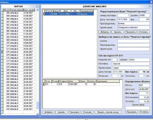 На малюнку 4.3.2 показаний інтерфейс роботи з рухом міцелію. Це ресурс міцелію, його розподілення та інші характеристики. При додаванні нової партії необхідний міцелій береться зі списку й додається. Програма автоматично запропонує рекомендований обсяг і допоможе не перевищити запит при меншій кількості на складі.