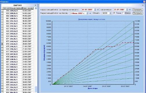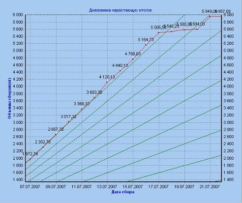 Звіти в програмне представлені у вигляді графіків, на яких можна побачити підсумки виробництва за різні періоди часу, а також місячні підсумки роботи підприємства, з налаштованими лініями тренда, для визначення в який день місяця обсяги збільшувалися й зменшувались. На малюнку 4.4.1 можна побачити дані зібрані за липень місяць 2007 року. На цей момент підприємство виготовляло понад 10 тон продукції на місяць.
