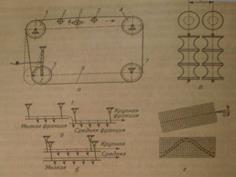 рис.6, в) имеют круглые или квадратные отверстия, образованные поперечными фигурными роликами соответствующей формы, а также щелевые (винтовые) отверстия. Наибольшее распространение для сортирования картофеля и репчатого лука получили сортирующие поверхности с поперечными роликами. Различная компоновка роликовых поверхностей позволяет осуществлять последовательное и параллельное выделение фракций.
