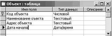 . Напротив каждого поля указываем тип данных: Числовой для кода объекта