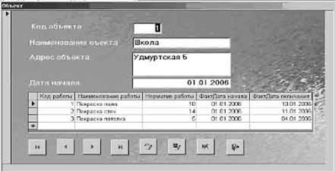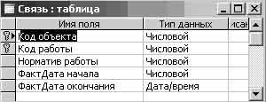 База данных должна содержать следующие сведения: код объекта, наименование объекта, адрес объекта, код работы, наименование работы, норматив на выполнение работы. фактические сроки начала и окончания работ на объекте.