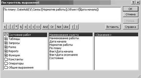 , возьмем из него поля Наименование объекта, Наименование работы, Дата начала, Норматив работы, По Плану, ФактДата начала, ФактДата окончании, Состояние.