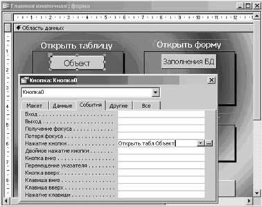 . Всплывает главная кнопочная форма. В области Открытия таблиц находиться две кнопки: Объект