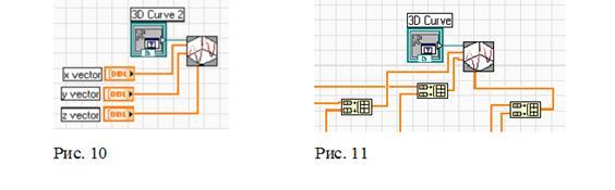 Для индикации траектории поиска используется графический индикатор 3DCurveGraph(рис. 10). Схема подсоединения к входам “xvector”, “yvector” и “zvector”, а также схема формирования массивов показана на рис. 11. На входы функций подаются одномерные массивы.