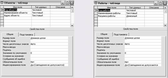 Для создания первичного ключа используем поле Код работы, уникальный номер для каждого вида работы. На рисунке 1 и рисунке 2 показана структура таблиц Объекты и Работы.