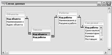 Рассмотрим выявленные информационные объекты на предмет связей между ними. Очевидно, что на одном и том же объекте может производиться несколько работ и что одна и та же работа может выполняться сразу на нескольких объектах, поэтому целесообразным будет установить связь "многие-ко-многим".