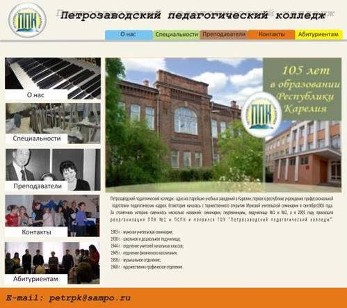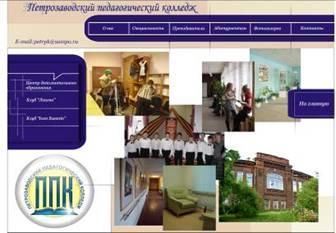 На Главной странице электронной визитки ГОУ «Петрозаводский педагогический колледж» находится шесть фотографий студентов различных отделений и фотография одного из зданий ГОУ «Петрозаводский педагогический колледж».