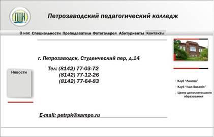 На ссылке «Контакты» - адрес, телефоны и e-mail ГОУ «Петрозаводский педагогический колледж».