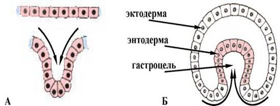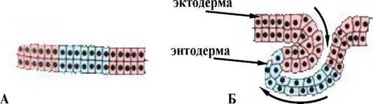 Мал. 1. Схема процесу інвагінації: А - рух пласта клітин; Б - инвагінаційна гаструла.