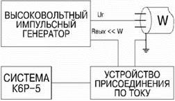 Структурная схема измерений частичных разрядов в кабельных линиях показана на рисунке. Основными узлами измерительной схемы являются: компьютерный анализатор дефектов и частичных разрядов в кабельных линиях и высоковольтный адаптер. Компьютерный анализатор дефектов и частичных разрядов в кабельных линиях может быть выполнен в виде совокупности измерительного блока и портативного компьютера (как показано на рисунке) или в виде специализированного измерительного прибора. Высоковольтный адаптер служит для развязки компьютерного анализатора и источника воздействующего напряжения. Так, короткие импульсы напряжения, распространяющиеся в кабельной линии, беспрепятственно проходят на вход рефлектометра TDR или на выход частичных разрядов, но не попадают в низкочастотный (50 или меньше герц) источник напряжения. В тоже время напряжение (1…1,2)*Uраб от источника беспрепятственно поступает на кабельную линию. В качестве воздействующего напряжения может служить напряжение промышленной сети или напряжения от источника сверхнизкой частоты.