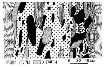 1 – гнейсы; 2 – среднезернистые пегматиты; 3 – кварц; 4 – мусковит.